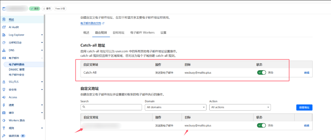 通过后,我们再去设置邮件路由规则(自定义地址、目标邮箱)。